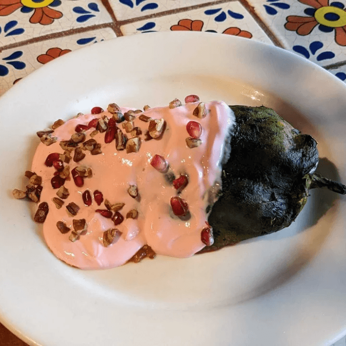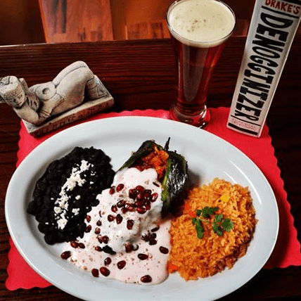 Roasted chile poblano filled with diced vegetables, fruits and nuts, topped with a sweet pomegranate and sherry wine crema, sprinkled with fresh pomegranate seeds, and crushed pecans. Served with rice and black beans