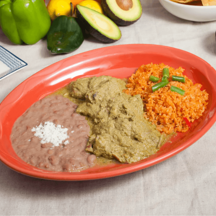Pork in green mole has a wonderful tangy and nutty flavor with balanced spiciness. A traditional dish from central Mexico made with pumpkin seeds, fresh chiles, tomatillo, and cilantro. Served with rice and refried beans